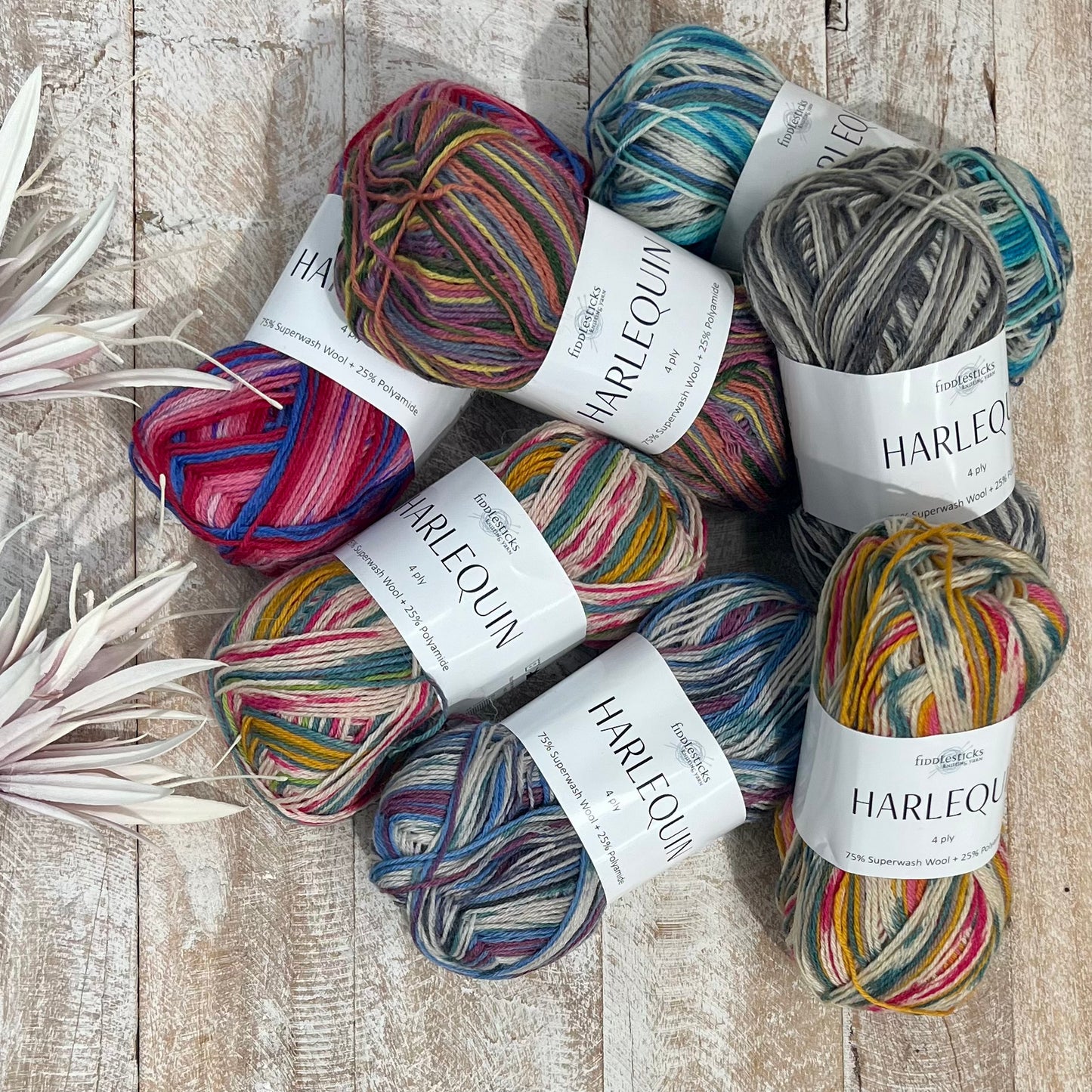 Harlequin Sock Yarn by Fiddlesticks is a wool blend made to bring dynamic colour and vibrancy to your next project. To make a pair of socks you need two balls to make the exact same sock pattern for each foot. A fantastic choice for socks, Harlequin is 75% Superwash Wool, 25% Polyamide and has 8 different colour blends.